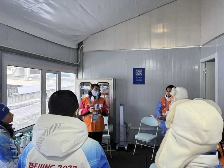 新冠疫情使得本次赛事无法借鉴之前的医疗保障工作经验,一切从零开始。202111月初,何宏涛副院长和赵孝先处长提前3个月来到崇礼,与北医三院的李明昊医疗助理合作,紧密开展各项协调筹备工作,包括与相关业务领域对接、制定制度保障方案、准备医疗站点物资、确定冬奥医疗保障队每位队员的医疗岗位,远程指导培训演练等。